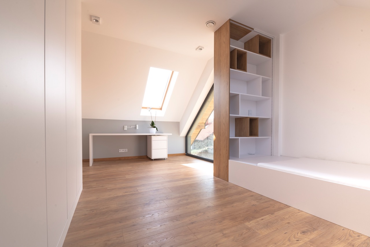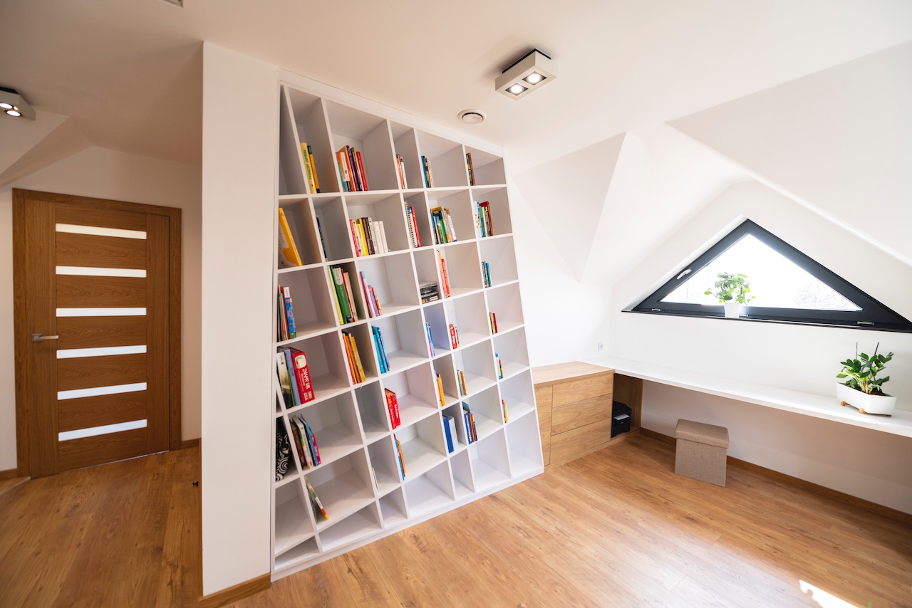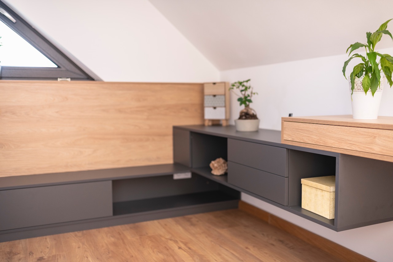 Białe płyty łączymy z akcentami drewna. W takim motywie zostają wyposażone w meble na wymiar pokoje dziecięcy i pracownia.