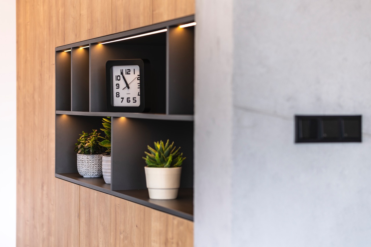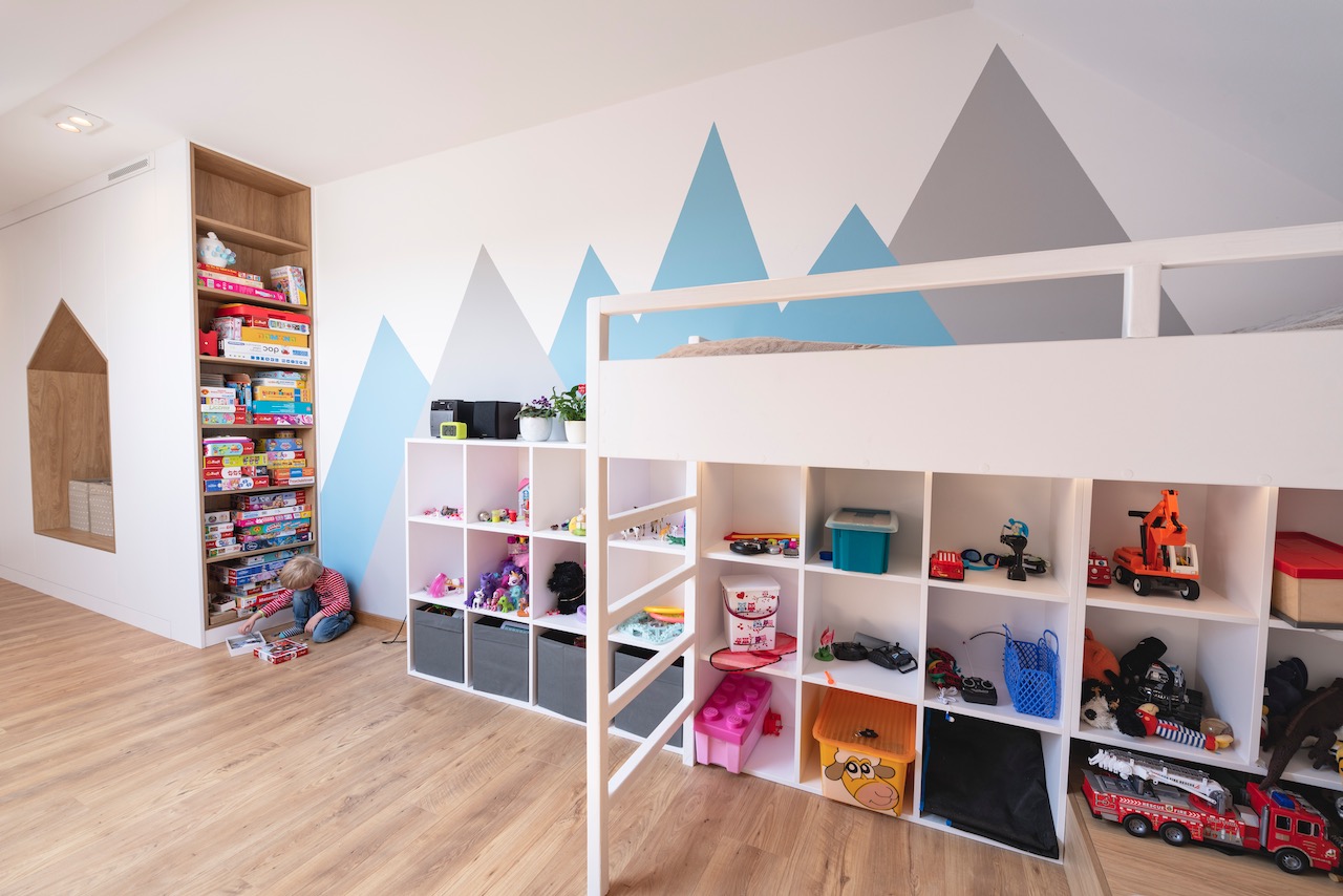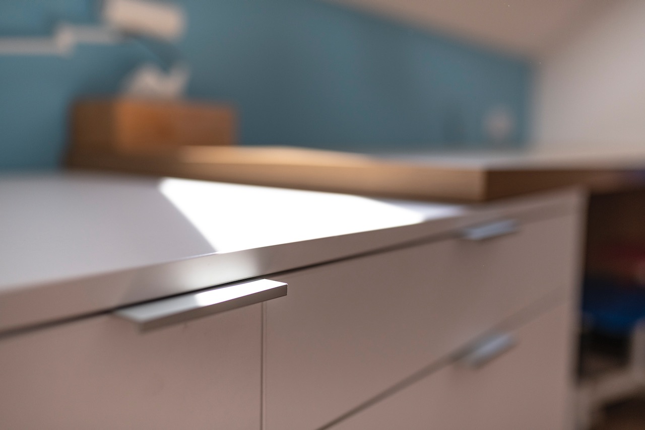 Białe płyty łączymy z akcentami drewna. W takim motywie zostają wyposażone w meble na wymiar pokoje dziecięcy i pracownia.