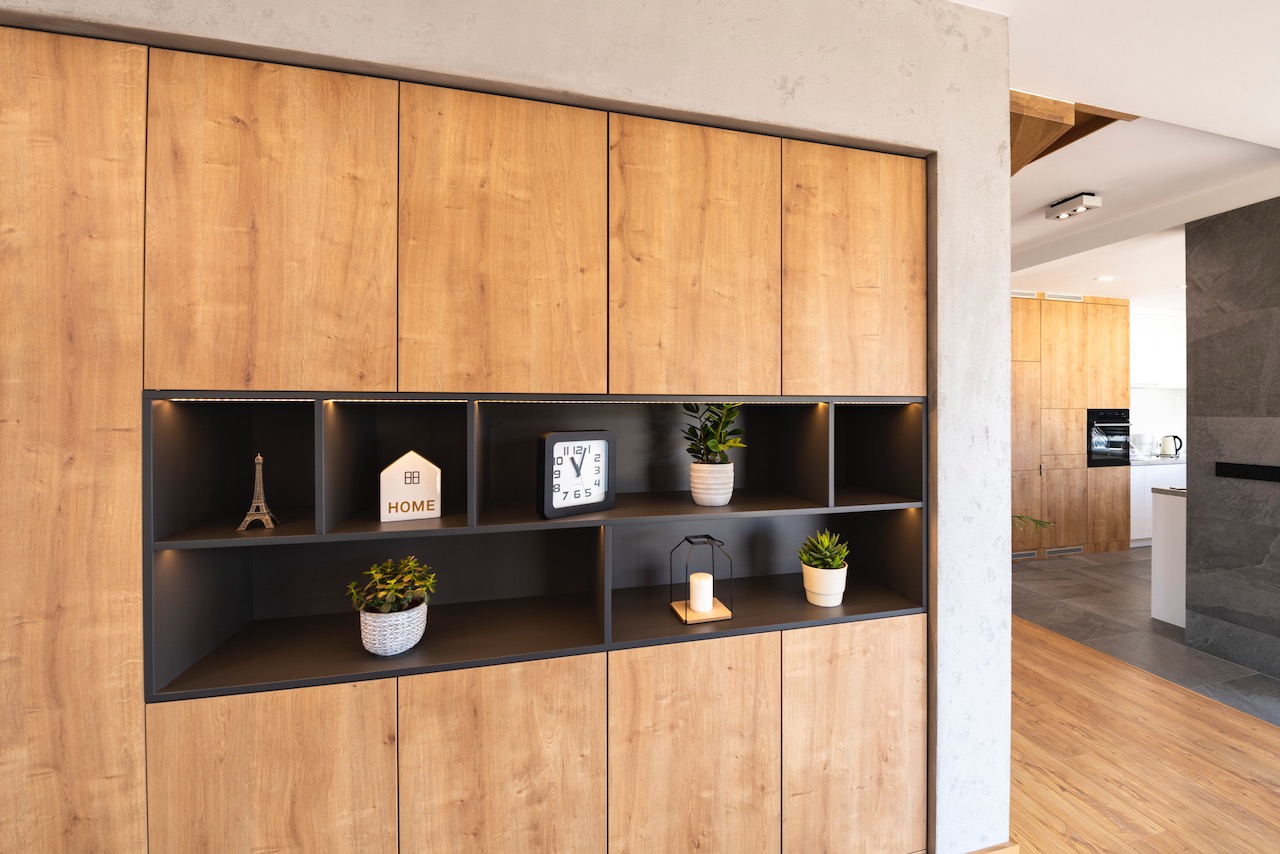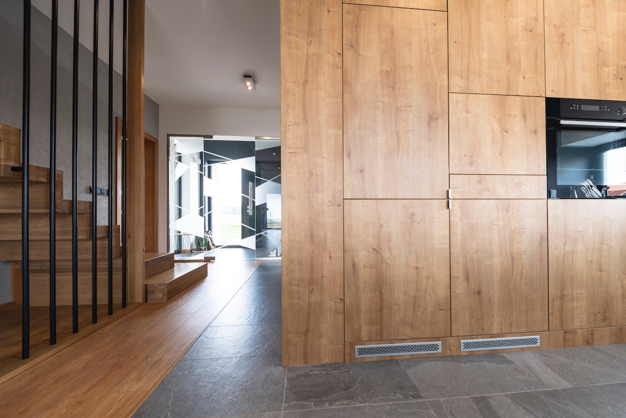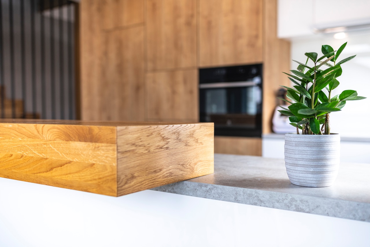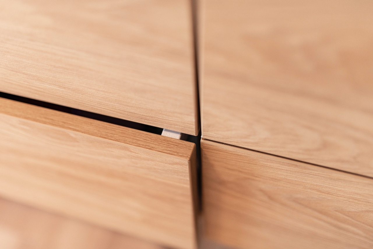 Łączymy duże powierzchnie ciepłego drewna z akcentami frontów w matowym graficie. Płaszczyzny frontów dzięki prowadnicom BLUM umożliwiają otwarcie szafki lub szuflady przez jej docisk. Nie muszą być wyposażane w wystające uchwyty co nadaje meblom bardzo eleganckiego i jednocześnie minimalistycznego wyglądu.