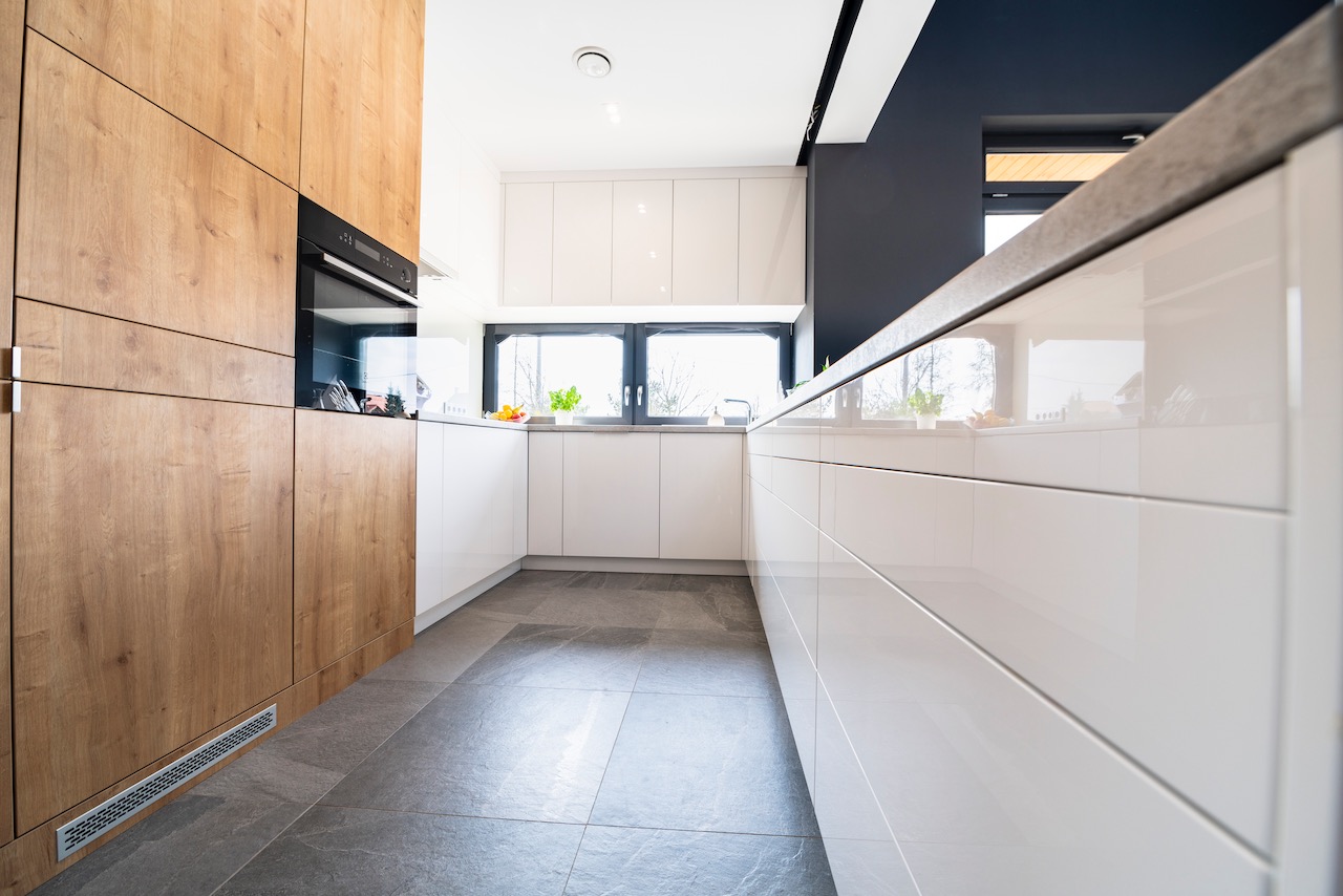 Zabudowa mebli na wymiar w układzie pomieszczenia, umożliwiła uzyskanie zdumiewającej wygody w wykonywaniu codziennych czynności. Dzięki względnie niewielkiej kuchni, szafki są oddalone od siebie w taki sposób, że na przykład opróżnianie zmywarki odbywa się przy minimalnej ilości ruchów, jakie musi wykonać użytkownik. To są zdecydowane zalety dobrze rozplanowanej ergonomii pracy w niewielkich pomieszczeniach, które szczególnie ujawniają się podczas intensywnego ich użytkowania.