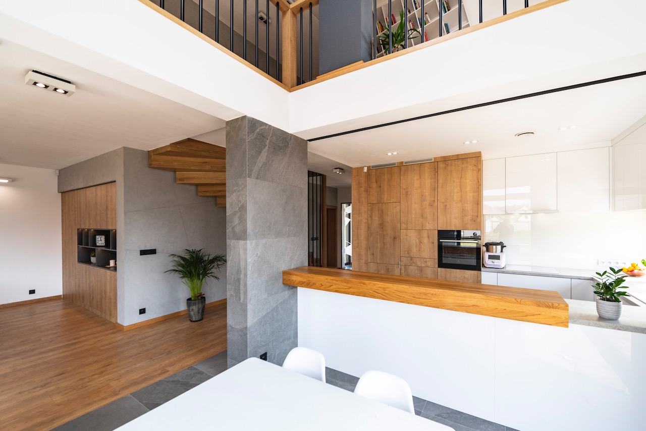 Użyte zostały elementy z prawdziwego drewna, wysokiej jakości drewnianych fornirów o ciepłym odcieniu dębu, które w połączeniu z szarymi akcentami konstrukcyjnymi i białym ścianami nadały całemu mieszkaniu klimatu, dzięki któremu pomimo minimalizmu odczuwa się przytulną domową atmosferę.