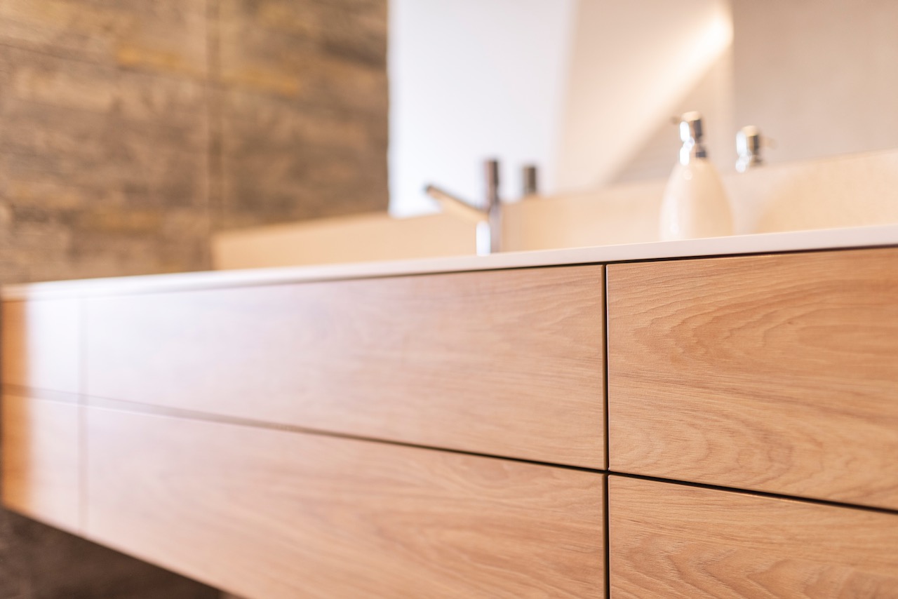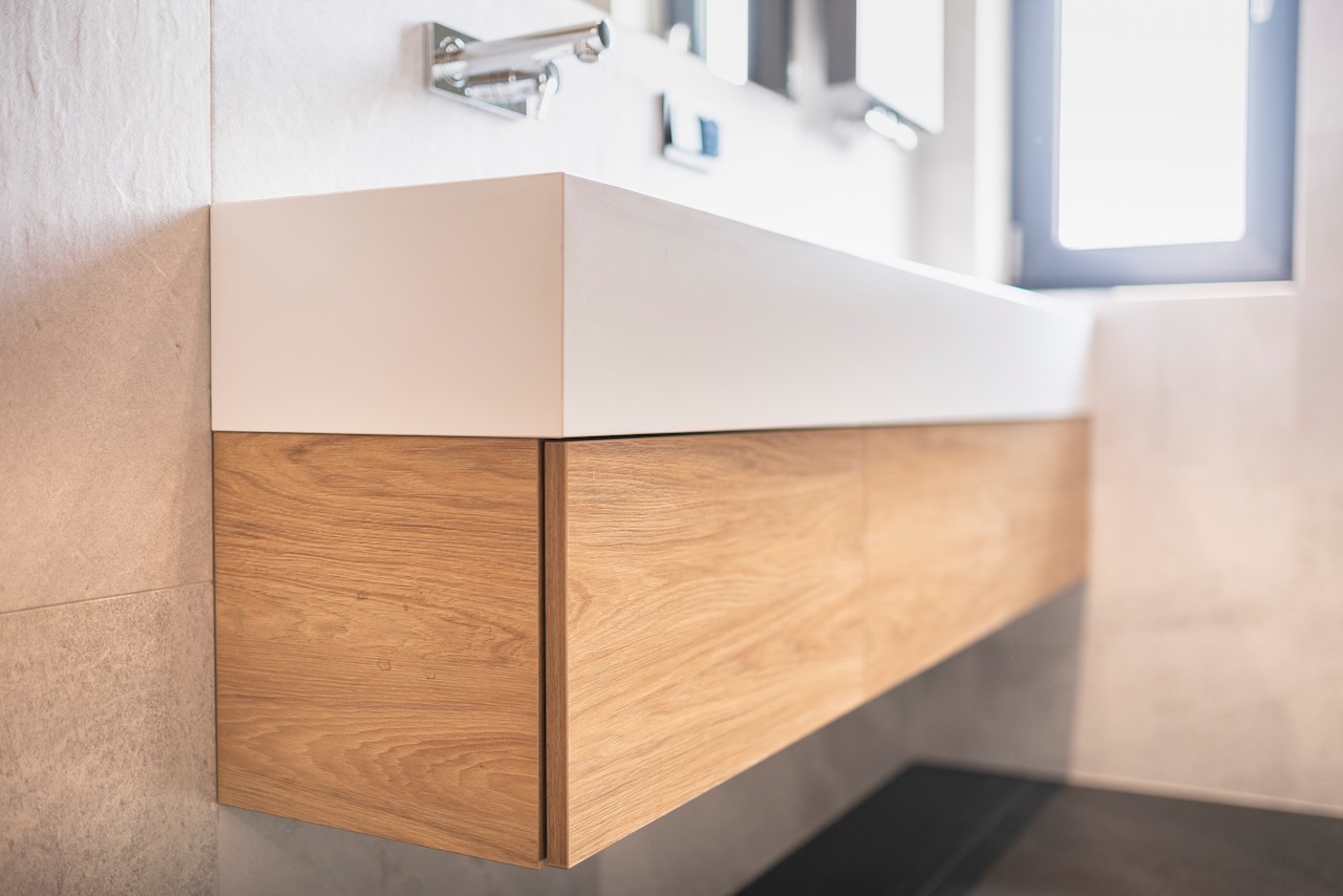 Meble sprawiają wrażenie lekkich poprzez podwieszenie ich do ściany, uwalniając przestrzeń całej podłogi. Jednocześnie są konstrukcją nośną dla umywalek.