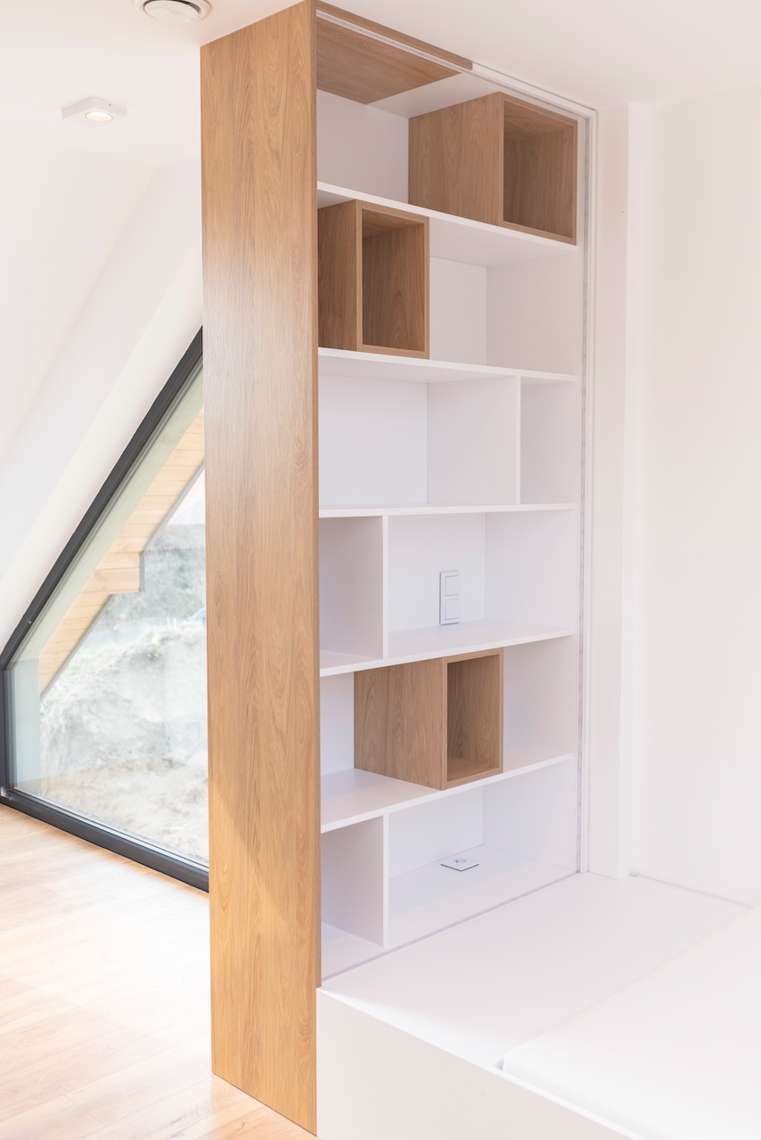 Zabudowa półek oparta o białą płytę zostaje przełamana skośną konstrukcją, która sama w sobie staje się ozdobą pomieszczenia.