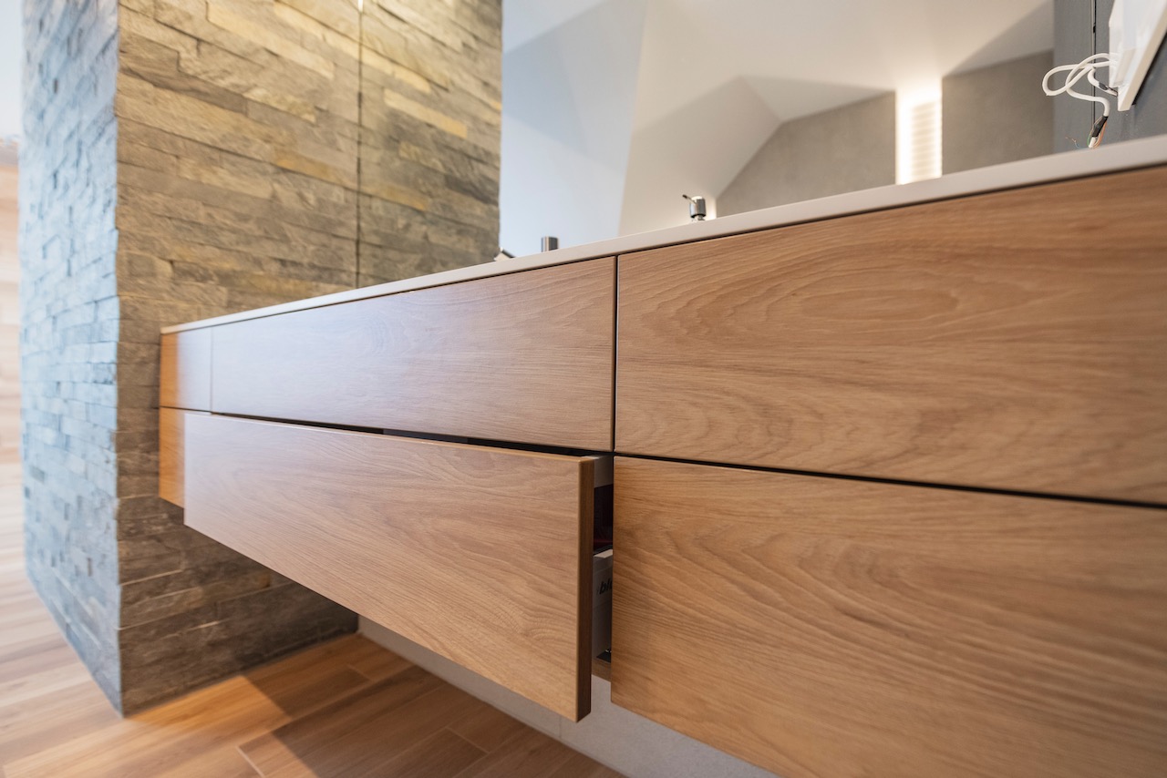 Szuflady otwierane przez docisk, dzięki wysokiej jakości osprzętowi marki BLUM.